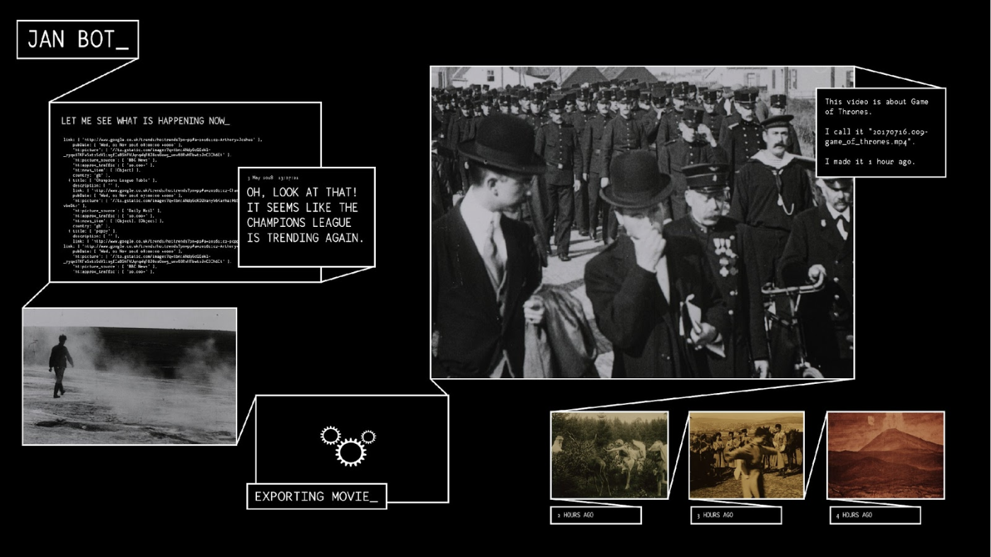 Jan Bot was EYE Filmmuseum’s first robot employee. Jan Bot was a computer program that worked day and night to create experimental films that match early twentieth century footage with current trending events.